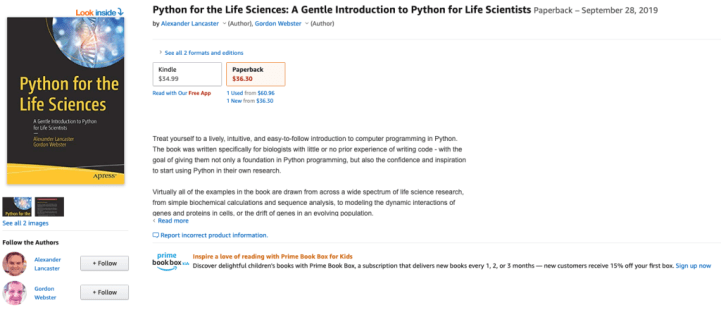 It’s official – Python for the Life Sciences is available for purchase as of September 28th, 2019. You can now pick up your eBook copy at Amazon! (The print edition is currently listed as “temporarily out of stock” – but you can still pre-order it – we’ll let you know when it’s fully stocked again).
